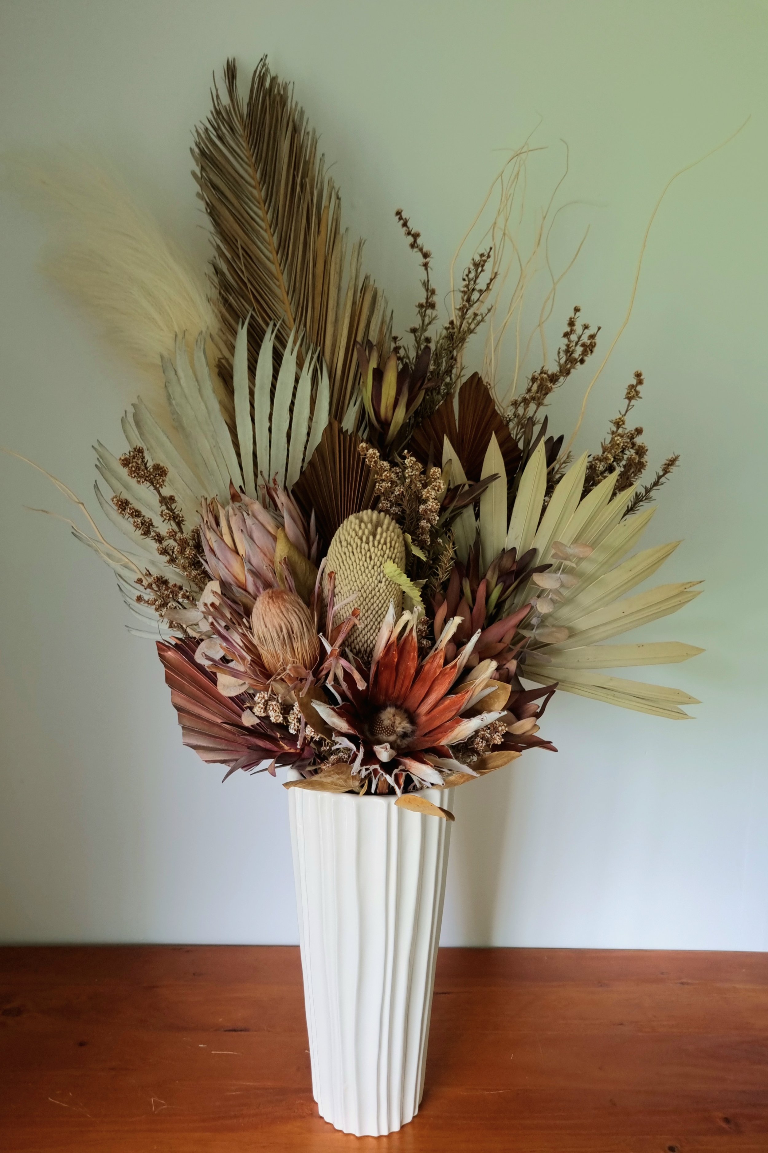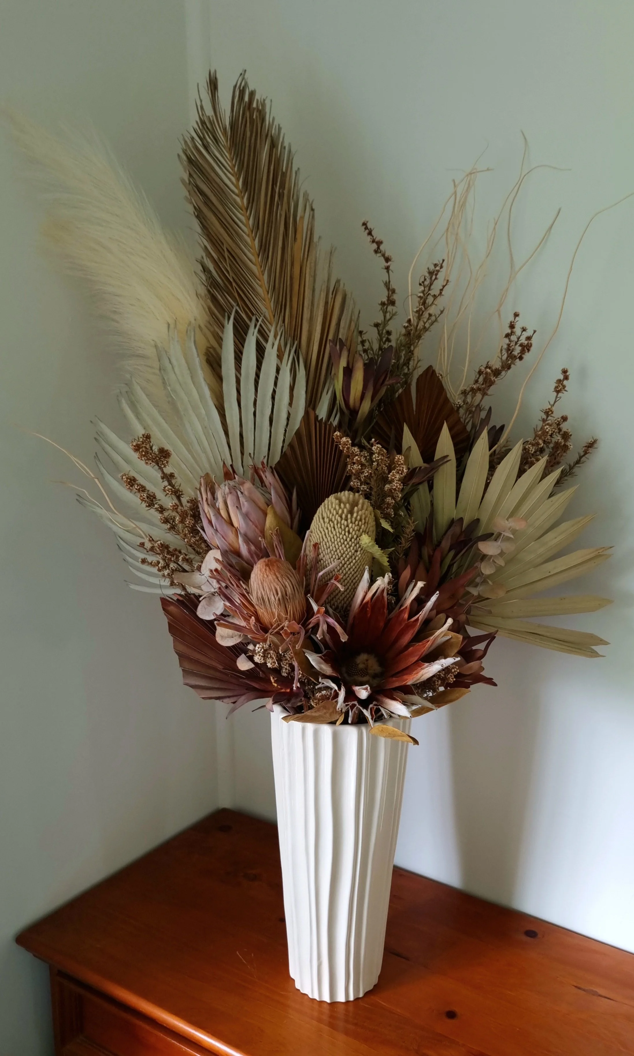 A classic combination of neutral whites, beige and brown tones with a mix of Dried and Faux flowers and designed into an elegant glazed ceramic Vase. This stunner stands at just over one metre tall making it great for a corner space or on a mantle to fill a blank wall.